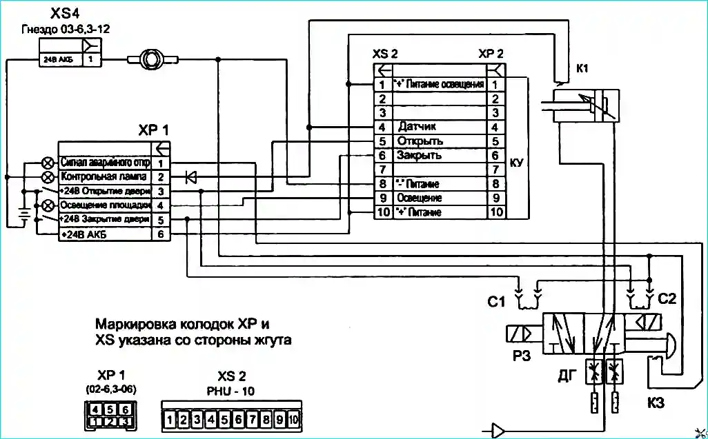 Схема электропневматическая привода дверей производства ООО "Камоцци пневматика": КУ - контроллер управления противозажимом; ХР1, ХР2 - колодка штыревая; XS2, XS3, XS4 - колодка гнездовая; C1, С2 - соленоиды пневмораспределителя; К3 - микропереключатель; К1- датчик; ДГ - дроссель-глушитель