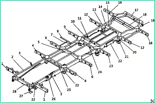 Основание кузова: 1 - консоль передняя; 2 - лонжерон передний; 3 - кронштейн амортизатора; 4 - консоль № 2; 5 - поперечина № 2; 6 - консоль №3; 7 - вставка соединительная лонжеронов; 8 - балка инструментального ящика; 9 - консоль №4; 10 - балка крепления амортизаторов; 11 - втулка крепления оси пружин подвески; 12 - консоль №5; 13 - косынка; 14 - лонжерон задний правый; 15 - поперечина № 4; 16 - консоль № 6; 17 - поперечина задняя; 18 - балка запасного колеса; 19 - буксирная проушина; 20 - усилитель; 21 - надстройка кронштейна рессоры; 22 - усилитель отбойника рессоры; 23 - консоль крепления бензобака; 24 - поперечина №3; 25 - поперечина №1; 26 - пластина крепления буфера рессоры; 27 - болт буксирной проушины; 28 - балка передняя