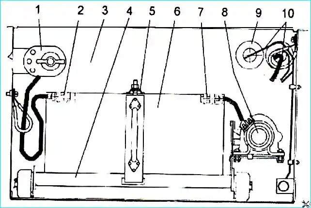 В аккумуляторном ящике имеется два выключателя АКБ: один поз. 8 (рис. 2) - отключение “ АКБ”, с дистанционным управлением от кнопки на щитке приборов; другой - поз. 1 - отключение “- АКБ” с механическим выключением.