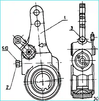 Удерживая фиксатор в утопленном положении, вращать его ключом (S=10) по часовой стрелке до совмещения отверстий корпуса регулятора и вилки тормозной камеры (рис. 7.).