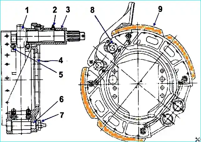 - 5. Ослабить у задних тормозных механизмов болты крепления опоры 7 разжимного кулака (рис. 5.).