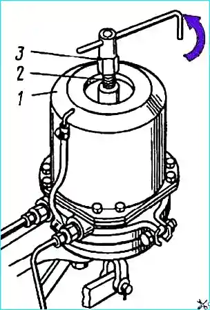 Дня механического растормаживания задних колес необходимо вывернуть ключом 3 (рис. 10.) винт 2 из пружинного энергоаккумулятора на длину 70 мм.
