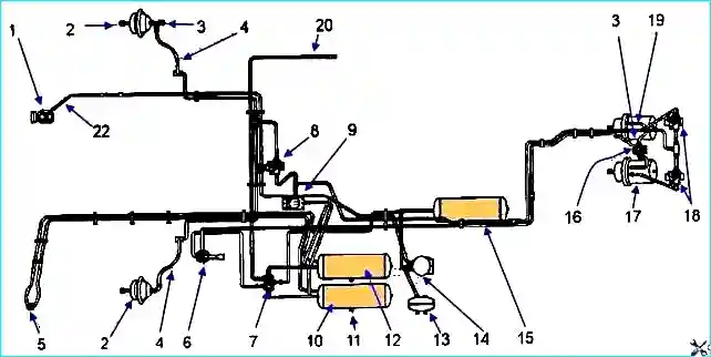Рабочая тормозная система состоит из колесных тормозных механизмов и пневматического привода. Схема пневматического привода тормозной системы показана на рис. 1.
