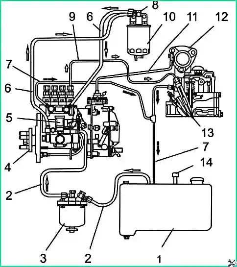 Схема системы питания: 1 - бак топливный; 2 - трубопровод всасывающий; 3 - фильтр грубой очистки топлива; 4 - насос топливный высокого давления; 5 - насос подкачивающий; 6 - трубопровод низкого давления; 7- трубопровод сливной; 8 - пробка прокачки топливной системы; 9 - трубопровод высокого давления; 10 - фильтр тонкой очистки топлива; 11 - трубка пневмокорректора; 12 - труба впускная; 13 - форсунка; 14 - клапан избыточного давления в баке