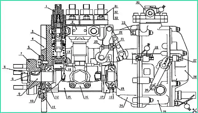 Топливный насос высокого давления: 1- секция топливного насоса; 2 - табличка; 3 - прокладка фланца; 4 - фланец; 5 - крышка подшипника; 6 - шпонка; 7 - полумуфта привода; 8 - гайка крепления полумуфты; 9 - кулачковый вал; 10 - манжета крышки подшипника; 11 - прокладка крышки подшипника; 12 - подшипник; 13 - направляющий штифт толкателя; 14 - толкатель; 15 - корпус топливного насоса; 16 - топливоподкачивающий насос; 17 - шпилька кронштейна поддержки ТНВД; 18 - регулировочные параметры; 19 - кольцо подшипника; 20 - болт; 21 - кронштейн; 22 - рычаг останова; 23 - болт; 24 - корпус регулятора; 25 - крышка регулятора; 26 - крышка смотрового люка; 27 - болт регулировки минимальной частоты вращения; 28 - болт регулировки максимальной частоты вращения; 29 - рычаг управления; 30 - корректор по наддуву; 31 - шпилька; 32 - гайка; 33 - шайба