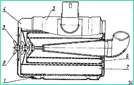 Воздушный фильтр (рис. 4) состоит из корпуса 5, двух фильтрующих элементов 6 и 7, крышки 4. Для обеспечения герметичности имеются резиновые прокладки.