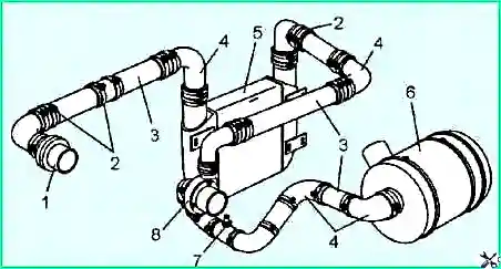 Система питания двигателя воздухом: 1 - труба воздухоподводящая; 2 - хомуты; 3 - труба; 4 - патрубок; 5 - охладитель наддувочного воздуха; 6 - фильтр воздушный; 7 - датчик сигнализатора засоренности фильтра; 8 - турбокомпрессор
