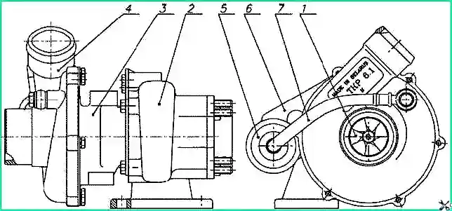 Турбокомпрессор: 1 - ротор; 2 - корпус турбины; 3 - корпус подшипника; 4 - корпус компрессора; 5 - исполнительный механизм; 6 - кронштейн крепления исполнительного механизма; 7- воздухопровод