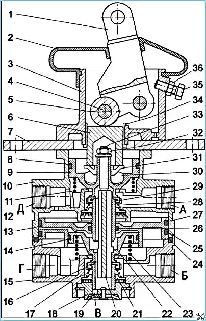 От выводов "Г" и "Д" сжатый воздух поступает к тормозным камерам. В корпусе крана установлены выключатели сигналов торможения.