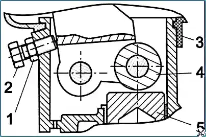 - Установить регулировочный болт до упора в рычаг так, чтобы не было зазора между роликом 4 и толкателем 5 (рис. 10), зафиксировать регулировочный болт 2.