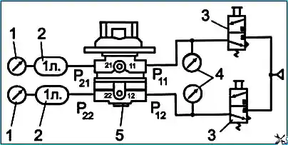 - Подать воздух под давлением Р11 = Р12 = 0,75 МПа (7,5 кгс/см 2) в выводы 11 и 12.