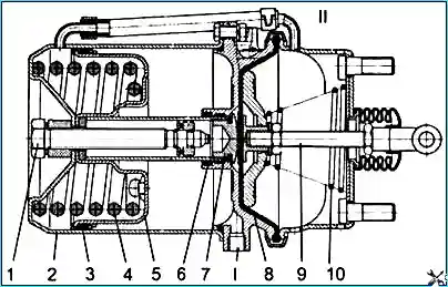 Тормозная камера с пружинным энергоаккумулятором предназначена для приведения в действие тормозных механизмов колес заднего моста при включении рабочей или стояночной тормозных систем.