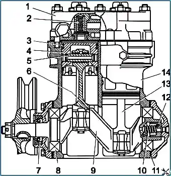 Масло из системы смазки по шлангу подается в канал коленчатого вала компрессора и к шатунным подшипникам.