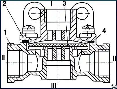 При падении давления в выводе "I" диафрагма 3 под действием сжатого воздуха в выводах "II" отрывается от выпускного седла в корпусе 1 и прижимается к седлу в крышке 2, перекрывая тем самым проход воздуха в вывод "I".