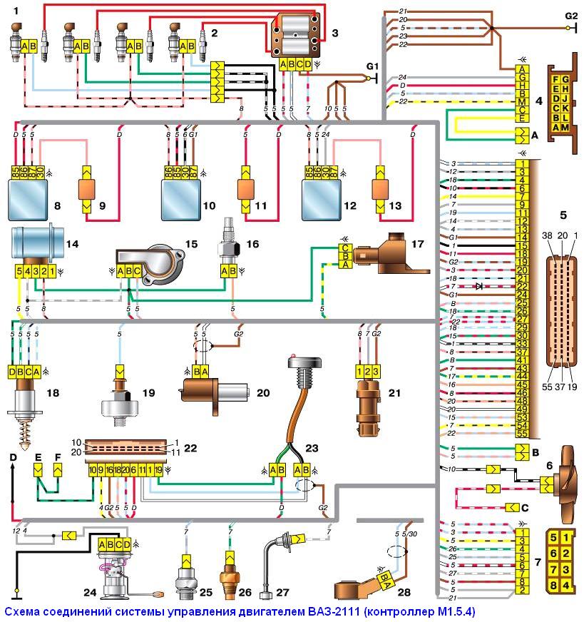 Схема соединений системы управления двигателем ВАЗ-2111 (контроллер М1.5.4)