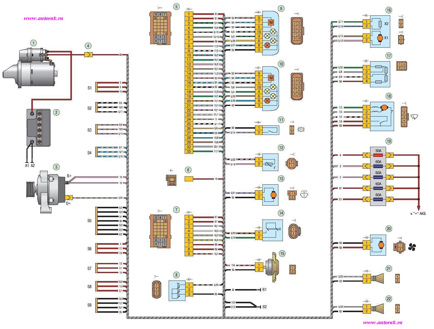 1 – стартер; 2 – аккумуляторная батарея; 3 – генератор; 4 – колодки жгута аккумуляторной батареи, стартера и жгута переднего; 5, 6, 7 – колодки жгута переднего к жгуту панели приборов; 8 – выключатель подкапотной лампы; 9 – левая фара; 10 – правая фара; 11 – датчик уровня тормозной жидкости; 12 – датчик температуры воздуха; 13 – электродвигатель омывателей; 14 – выключатель лампы света заднего хода; 15 – электровентилятор двигателя; 16 – моторедуктор заслонки отопителя; 17 – добавочный резистор; 18 – электродвигатель стеклоочистителя;19 – основной блок предохранителей; 20 – электродвигатель отопителя; 21– тревожный сигнал; 22 – звуковой сигнал;А1, А2, В1, В2 – точки заземления жгута переднего