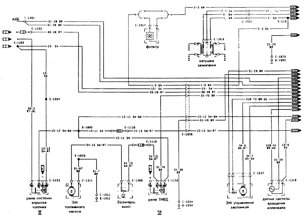 Принципиальная электрическая схема Ford Fiesta (двигатель 1.1(HSS-Valencia) с системой впрыска топлива CFJ соответствующий нормативам США на 1983г.)