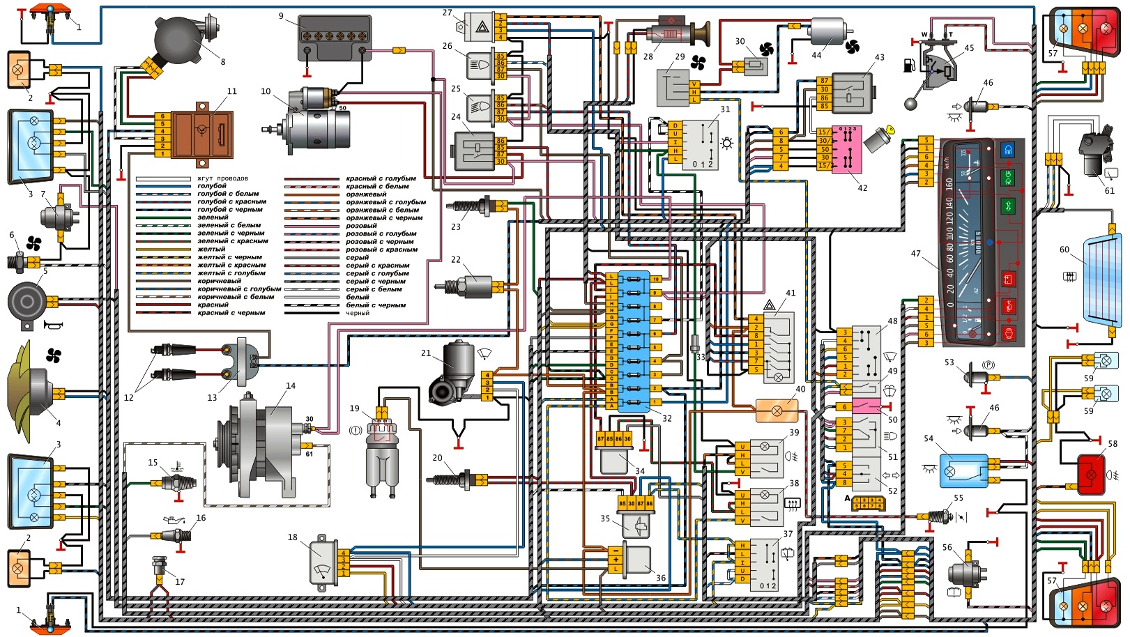 1 – боковой повторитель указателя поворота; 31 – выключатель наружного освещения; 2 – передний указатель поворота; 32 – блок предохранителей; 3 – фара; 33 – предохранитель цепи противотуманного фонаря; 4 – электродвигатель вентилятора системы охлаждения; 34 – реле включения обогрева заднего стекла; 5 – звуковой сигнал; 35 – реле включения электродвигателя вентилятора системы охлаждения; 6 – датчик включения электродвигателя вентилятора; 36 –реле-прерыватель контрольной лампы включения стояночного тормоза; 7 – электродвигатель омывателя ветрового стекла; 37 – выключатель очистителя и омывателя заднего стекла; 8 – датчик момента искрообразования; 38 – выключатель обогрева заднего стекла; 9 – аккумуляторная батарея; 39 – выключатель заднего противотуманного фонаря; 10 – стартер; 40 – контрольная лампа прикрытия воздушной заслонки карбюратора; 11 – коммутатор; 41 –выключатель аварийной сигнализации; 12 – свечи зажигания; 42 – выключатель зажигания; 13 –катушка зажигания; 43 – реле зажигания; 14 – генератор; 44 – электродвигатель вентилятора отопителя; 15 – датчик указателя температуры охлаждающей жидкости; 45 – датчик указателя уровня топлива; 16 – датчик контрольной лампы недостаточного давления масла; 46 – выключатель плафона в стойке двери; 17 – розетка для переносной лампы; 47 – комбинация приборов; 18 – реле стеклоочистителя; 48 – переключатель очистителя ветрового стекла; 19 – датчик уровня тормозной жидкости; 49 – выключатель омывателя ветрового стекла; 20 – выключатель сигнала торможения; 50 – выключатель звукового сигнала; 21 – электродвигатель очистителя ветрового стекла; 51 – переключатель света фар; 22 – электромагнитный клапан карбюратора; 52 – переключатель указателей поворота; 23 – выключатель света заднего хода; 53 – выключатель контрольной лампы включения стояночного тормоза; 24 – реле включения стартера; 54 – плафон освещения салона; 25 – реле включения ближнего света фар; 55 – выключатель контрольной лампы прикрытия воздушной заслонки карбюратора; 26 – реле включения дальнего света фар; 56 – электродвигатель омывателя стекла задней двери; 27 – реле-прерыватель аварийной сигнализации и указателей поворота; 57 – задний фонарь; 28 – прикуриватель; 58 – задний противотуманный фонарь; 29 – переключатель вентилятора отопителя; 59 – фонарь освещения номерного знака; 30 – дополнительный резистор электродвигателя отопителя; 60 – элемент обогрева стекла задней двери; 61 – электродвигатель очистителя стекла задней двери; А – порядок нумерации контактов в соединительных колодках