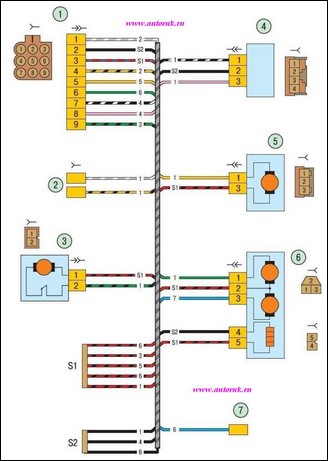 ВАЗ-2170 Lada Priora. Соединения жгута проводов правой передней двери: 1 – колодка жгута проводов дополнительного заднего правого к жгуту заднему; 2 – колодка жгута проводов дополнительного заднего правого к громкоговорителю переднему правому; 3 – электродвигатель стеклоподъемника; 4 – переключатель стеклоподъемника;5 – электродвигатель блокировки правой передней двери; 6 – электродвигатель и электронагреватель правого наружного зеркала; 7 – колодка жгута проводов дополнительного заднего правого к жгуту заднему