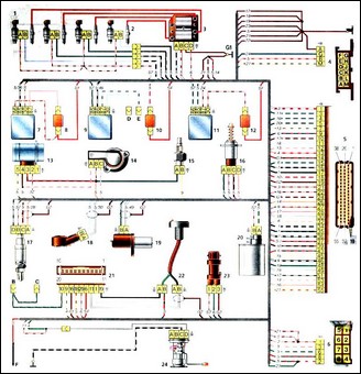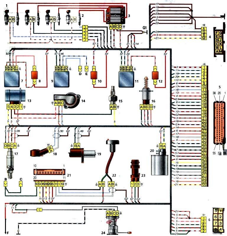1 - форсунки; свечи зажигания; 3 - модуль зажигания; 4 - колодка диагностики; 5 - контроллер; 6 - колодка, присоединяемая к жгуту проводов панели приборов; 7 - главное реле; 8 - предохранитель, защищающий цепи главного реле; 9 - реле электровентилятора; 10 - предохранитель, защищающий цепи реле электровентилятора; 11 - реле электробензонасоса; 12 - предохранитель, защищающий цепи реле электробензонасоса; 13 - датчик массового расхода воздуха; 14 - датчик положения дроссельной заслонки; 15 - датчик температуры охлаждающей жидкости; 16 - регулятор холостого хода; 17 - датчик кислорода; 18 - датчик детонации; 19 - датчик положения коленчатого вала; 20 - электромагнитный клапан продувки адсорбера; 21 - блок управления автомобильной противоугонной системы (АПС); 22 - индикатор состояния АПС; 23 - датчик скорости автомобиля; 24 - электробензонасос с датчиком уровня топлива; F - к клемме «+» аккумуляторной батареи; В - колодка, присоединяемая к выключателю плафона освещения; С - колодка, подключаемая к бело-черным проводам, отсоединенным от выключателя плафона освещения; D - колодка, подключаемая к монтажному блоку (Х5/5); Е - колодка, подключаемая к жгуту проводов электровентилятора; G1, G2 - точки заземления Наряду с буквенным обозначением цвета проводов на данной схеме применяется обозначение номера элемента схемы, к которому присоединяется данный провод, например «-5-». Условное обозначение «S7» или «SF» указывает на то, что провод подсоединяется к элементу «-7-» или «F» через точку соединения, не показанную на схеме.