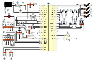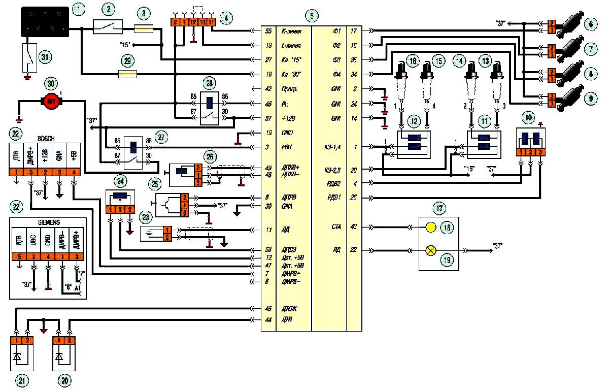 Соединения системы управления двигателем мод. ЗМЗ-409 (Евро-2): 1 — аккумуляторная батарея: 2 — выключатель (замок) зажигания: 3, 29 — плавкие предохранители: 4 — диагностическая колодка: 5 — электронный блок управления двигателем: 6, 7, 8, 9 — топливные форсунки; 10— регулятор холостого хода: 11, 12 — катушки зажигания; 13, 14, 15, 16— свечи зажигания; 17— комбинация приборов: 18 — тахометр; 19 — сигнальная лампа «ПРОВЕРЬТЕ ДВИГАТЕЛЬ»; 20 — датчик температуры воздуха во впускной трубе: 21 — датчик температуры охлаждающей жидкости: 22 — датчик массового расхода воздуха: 23 — датчик детонации; 24 — датчик положения дроссельной заслонки: 25 — датчик положения распределительного вала: 26 — датчик положения коленчатого вала: 27 — реле топливного насоса: 28 — главное реле системы управления двигателем: 30 — топливный насос: 31 — выключатель «массы»