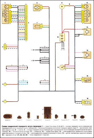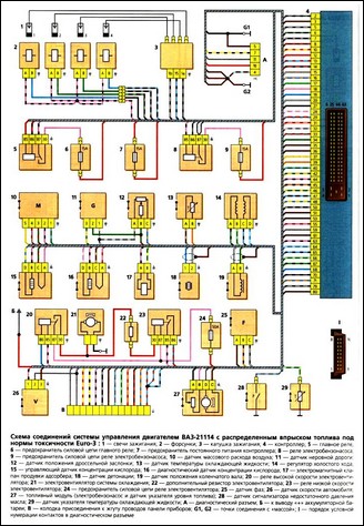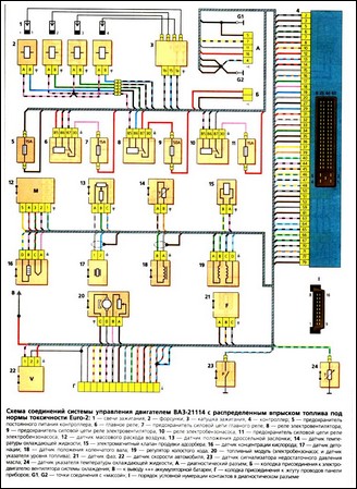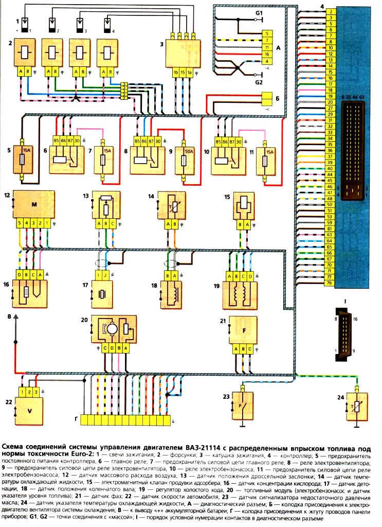 Схема соединений системы управления двигателем ВАЗ-21114 с распределенным впрыском топлива под нормы токсичности Euro-2