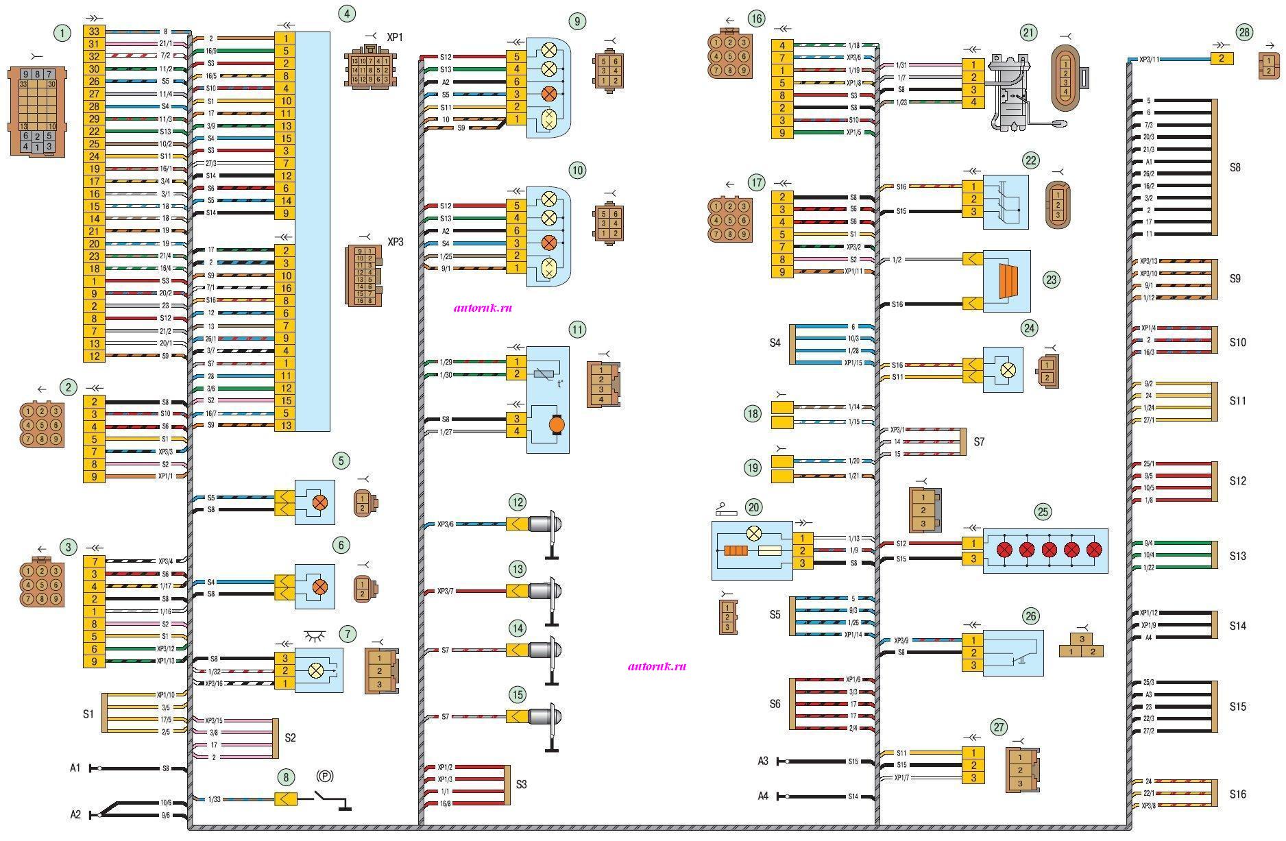 1 – колодка жгута проводов заднего к жгуту панели приборов;2 – колодка жгута проводов заднего к жгуту левой задней двери; 3 – колодка жгута проводов заднего к жгуту правой передней двери; 4 – контроллер электропакета;5 – боковой указатель поворотов левый; 6 – боковой указатель поворотов правый; 7 – плафон освещения салона;8 – выключатель контрольной лампы стояночного тормоза; 9 – левый фонарь; 10 – правый фонарь;11 – датчик температуры воздуха салона; 12, 13, 14, 15 – выключатели плафона освещения салона; 16 – колодка жгута проводов заднего к жгуту левой передней двери; 17 – колодка жгута проводов заднего к жгуту правой задней двери;18 – колодки жгута заднего к громкоговорителю заднему правому; 19 – колодки жгута заднего к громкоговорителю заднему левому; 20 – прикуриватель;21 – модуль электробензонасоса; 22 – выключатель освещения багажника; 23 – элемент обогрева заднего стекла;24 – фонарь освещения багажника; 25 – дополнительный стоп-сигнал; 26 – выключатель привода замка багажника;