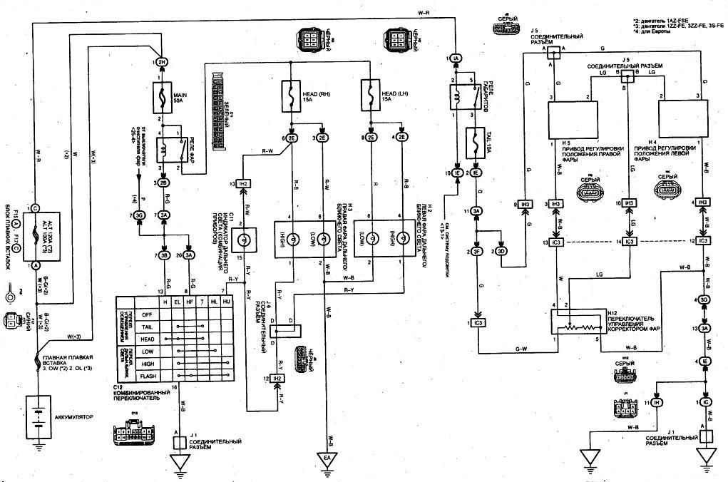 Схема системы регулирования положения фар (модели выпуска с 07/2000г.)