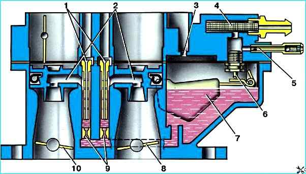 Из поплавковой камеры топливо поступает через главные топливные жиклеры 9 в эмульсионные колодцы и смешивается с воздухом, выходящим из отверстий эмульсионных трубок 1, которые изготовлены заодно с главными воздушными жиклерами.