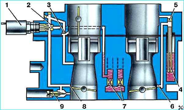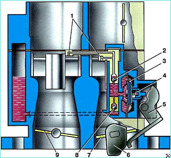 Рис. 4. Схема ускорительного насоса: 1 - распылители; 2 - шариковый клапан подачи топлива; 3 - диафрагма насоса; 4 - толкатель; 5 - рычаг привода; 6 - кулачок привода насоса; 7 - дроссельная заслонка первой камеры; 8 - обратный шариковый клапан; 9 - дроссельная заслонка второй камеры