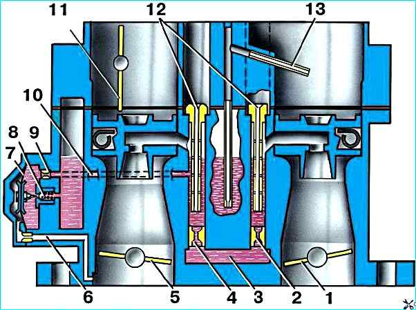 Топливо, проходящее через жиклер 9 экономайзера, добавляется к топливу, которое проходит через главный топливный жиклер 4, обогащая горючую смесь.