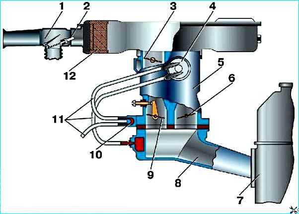 Рис. 6. Схема подсоединения шлангов полуавтоматического пускового устройства карбюратора 21083–1107010-31: 1 - терморегулятор; 2 - термосиловой элемент терморегулятора; 3 - воздушная заслонка; 4 - жидкостная камера; 5 - карбюратор; 6 - дроссельная заслонка второй камеры; 7 - двигатель; 8 - впускная труба; 9 - дроссельная заслонка первой камеры; 10 - блок подогрева карбюратора; 11 - шланги охлаждающей жидкости; 12 - воздушный фильтр