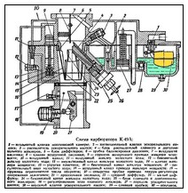 Карбюратор К-49А так же, как и карбюратор К-22Г вертикальный, с падающим потоком смеси, сбалансированный, имеет съемный блок из двух диффузоров с прикрепленными к горловине упругими пластинами и регулируемый иглой главный жиклер