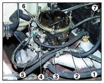 Отвернуть винт 6 крепления тяги 2 к рычагу привода воздушной заслонки, отвернуть винт 1 крепления тяги к кронштейну и отсоединить тягу от карбюратора