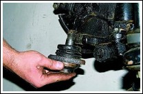 Работаем на смотровой канаве. Отсоединяем от левого маятникового рычага продольную и поперечную рулевые тяги (см. Как заменить рулевые тяги автомобиля Соболь)