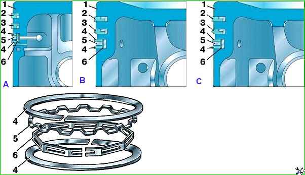 Двигатель УМЗ–4218.10 может комплектоваться двумя вариантами исполнения компрессионных колец ( рис. 1, B, C).