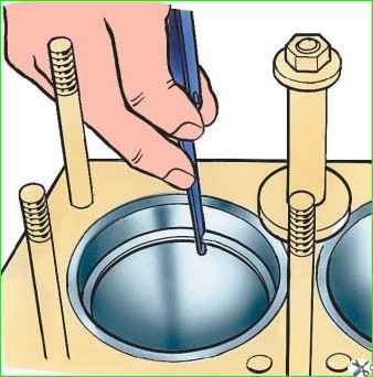 К перешлифованным цилиндрам подгоняйте кольца по верхней части, а к изношенным – по нижней части цилиндра (в пределах хода поршневых колец).