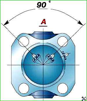 - 4. Установите крестовины и вилки шарниров так, чтобы пресс-масленки шлицевого соединения и крестовины, расположенной у моста, находились в одной плоскости и на одной стороне вала, а масленка крестовины противоположного конца вала – на 90° против часовой стрелки, если смотреть со стороны моста (рис. 4).