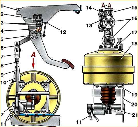 1, 20 - кронштейны; 2 - выключатель сигнала торможения; 3 - гайки; 4 - буфер-упор; 5 - педаль; 6 - промежуточная вилка; 7 - вилка; 8 - контргайка; 9 - тяга; 10 - чехол; 11 - промежуточный рычаг; 12 - оттяжная пружина; 13 - выключатель сигнальной лампы аварийного состояния тормозной системы; 14 - сигнальное устройство; 15 - корпус главного тормозного цилиндра; 16 - бачки; 17, 19 - гайки; 18 - вакуумный усилитель; 21 - вилка толкателя