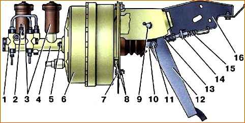 1 - сигнальное устройство; 2 - выключатель сигнальной лампы аварийного состояния гидропривода тормозной системы; 3 - бачки; 4 - корпус главного тормозного цилиндра; 5, 8 - гайки; 6 - вакуумный усилитель; 7 - пластина; 9 - ось педали; 10 - вилка; 11 - палец; 12 - педаль; 13 - упор; 14 - выключатель сигнала торможения; 15 - оттяжная пружина; 16 - кронштейн