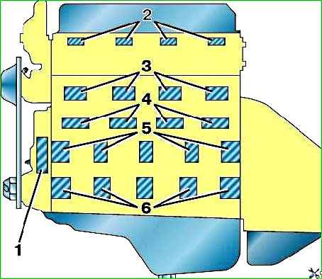 - - стуки толкателей и шеек распределительного вала – со стороны расположения распределительного механизма, на уровне оси распределительного вала;