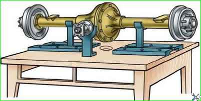 Установите мост на стенд (рис. 1), отверните пробки маслоналивного и маслосливного отверстий и слейте масло.