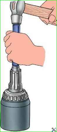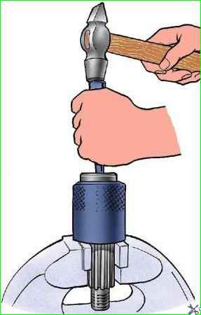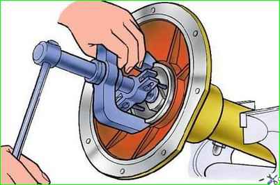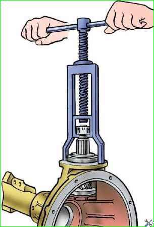 Снимите маслоотгонное кольцо, выпрессуйте приспособлением ведущую шестерню (рис. 2) с подшипниками в сборе из картера.