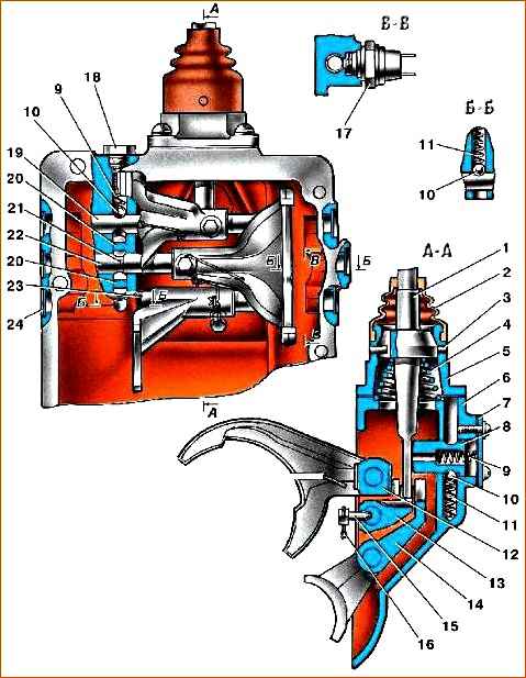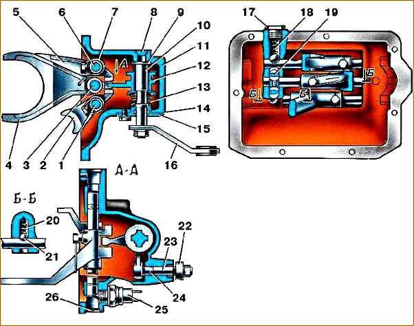 1 - шток вилки включения заднего хода; 2 - вилка заднего хода; 3 - шток вилки включения III и IV передач; 4 - вилка III и IV передач; 5 - вилка I и II передач; 6 - шток вилки включения I и II передач; 7 - шплинт-поволока; 8 - заглушка; 9 - шайба; 10 - вал переключения передач; 11 - боковая крышка; 12 - муфта переключения передач; 13 - блокирующая пружина; 14 - прокладка; 15 - крышка сальника; 16 - рычаг переключения; 17 - пробка; 18, 20 - пружины фиксатора; 19 - замочный плунжер; 21 - шарик фиксатора; 22 - рычаг выбора передач; 23 - избирательный рычаг; 24 - штифт; 25 - выключатель фонаря заднего хода; 26 - заглушка