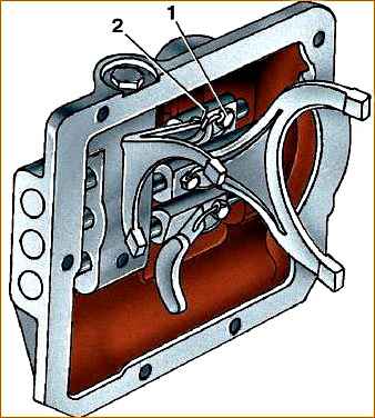 - 6. Переверните крышку большим фланцем вверх и заложите в гнезда фиксаторов пружины и шарики для штоков III и IV передач и штока заднего хода.
