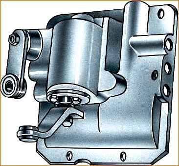 - 13. Установите на крышку опору вместе с рычагом так, чтобы рычаг вошел в пружину, а опора своим приливом закрыла отверстие в корпусе и закрепите опору четырьмя винтами с пружинными шайбами.