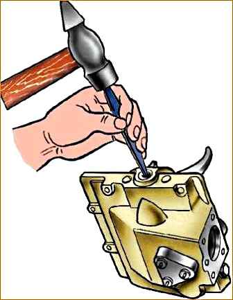 - 9. Установите шесть заглушек в торцевые отверстия корпуса крышки, заглушку – в отверстие для вала переключения и расчеканьте их.