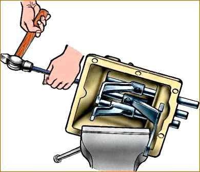 - 5. Выпрессуйте штоки (рис. 3) вилок переключения через отверстия в крышке, где сняты заглушки, и снимите вилки.