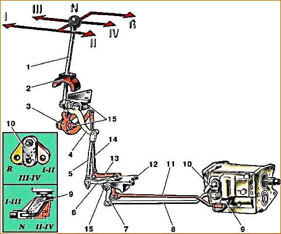 1 - рычаг переключения передач; 2 - уплотнитель механизма; 3 - выбирающий рычаг механизма; 4 - переключающий рычаг механизма; 5 - вертикальная тяга переключения; 6 - промежуточный рычаг переключения; 7 - промежуточный рычаг выбора; 8 - горизонтальная тяга выбора; 9 - рычаг переключения передач; 10 - рычаг выбора передач; 11 - горизонтальная тяга переключения; 12 - кронштейн промежуточный рычагов; 13 - промежуточный рычаг выбора; 14 - вертикальная тяга выбора; 15 - пресс-масленки