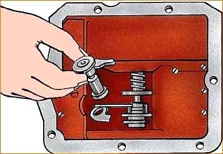 - 7. Выньте два замочных плунжера через отверстие фиксатора I и II передач.